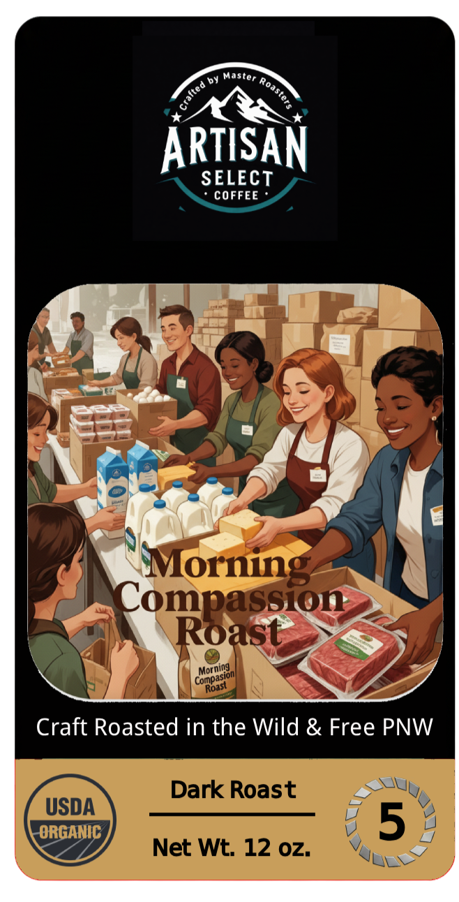 Morning Compassion RoastThis is the daily cup with a conscience. Morning Compassion Roast is a smooth, full‑bodied medium blend crafted for people who want their first mug of the day to actually do something in the world.Tasting notes: gentle dark chocolate, toasted almond, and a lingering caramel finish that stands up to cream but is balanced enough to sip black.Every bag is roasted in small batches in the Pacific Northwest and tied to a simple commitment: a portion of proceeds goes directly to local food banks working to keep essentials like milk, eggs, and cheese on the shelves for families in need.Brew it at home, take it to work, or serve it at community events—Morning Compassion Roast is designed to wake you up, ground you in gratitude, and pour a little more care back into Seattle every time you press “brew.”